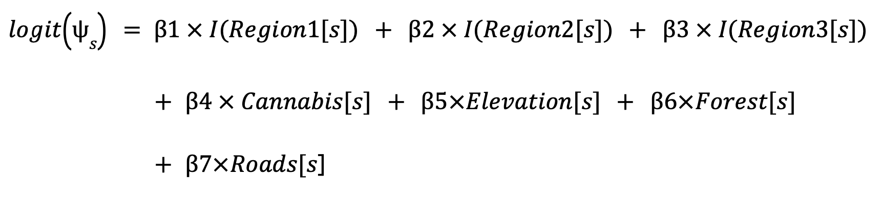 Where I(RegionX[s]) is an indicator variable equal to 1 if site s is in Region X, and 0 otherwise, Cannabis is the square root of distance to cannabis, Elevation is the elevation in meters at the camera site, Forest is the proportion of area around each camera site that is forested within a 50 m buffer, and Roads is the distance from the nearest paved roadway. All continuous variables were scaled.