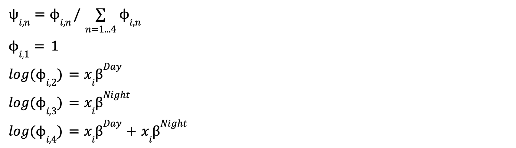 where ψi is a vector of length 4 where the nth element, ψi,n, gives the probability that the true occupancy state of site i is n. Mirroring the detection states, there are four true occupancy states: (1) the site is not occupied by the species, (2) the site is occupied by the species only during the day, (3) the site is occupied by the species only at night, and (4) the site is occupied by the species during both the day and night. The multi-state occupancy probabilities ψi are associated with covariates using a multinomial logit link, as