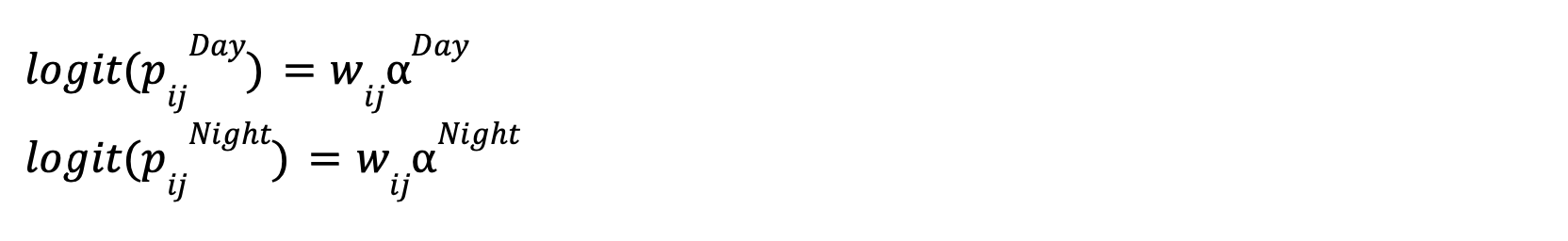 where pijDay is the probability that the species is detected only during the day given that it only occupies the site during the day, and is linked to daytime coefficients αDay and a vector of covariates wij influencing detection, and equivalently for nighttime detection. Then, the elements of the detection matrix are